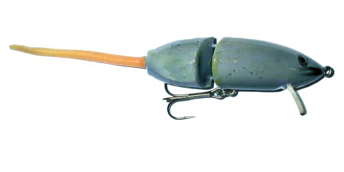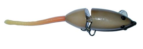 The Rago rat was debuted after many years of secrecy in the fall of 2002. The original baits were wood, but the production baits now are synthetic. The baits are very light and buoyant and use a Crème worm for the tail section. The rat measures 8" total lenth (4 and ¼" for the body) and come stock with a VMC hook. The Rago Mouse came out in late 2003. The mouse is 6 and ¾" total length.