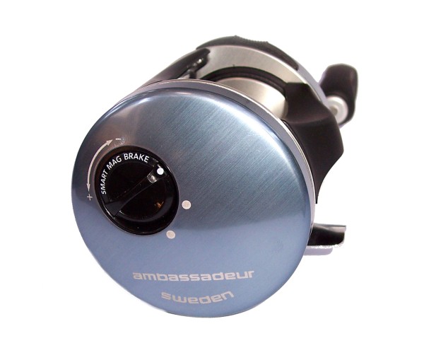 Introduced in 2005, the Abu Garcia D6 6600 adds a light, compact, and high-speed round reel to their freshwater line-up. The D6 diverges from the classic Ambassadeur series with several new features. These include the SmartMag brake system, which combines the spool tension with a magnetic brake. The reel's exterior frame was also redesigned. It is lightweight, weighing in at only 9.3oz, and compact without any of the sharp edges you see on the C3/C4 series. The reel features a high-speed 6.3:1 ratio, powered by a vented soft-paddle handle. Other features include 6 bearings, a clicker, and a disengaging level wind.