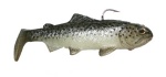 Overview/History: The Mattlures 6” Swimbait was released in early 2006. This sinking swimbait weighs in at 1.35oz and uses a 4/0 Mustad Ultrapoint black nickel hook. There are currently four colors available: Light Trout, Dark Trout, Salmon, and Hitch. More colors including a Perch color will be made available in the future. Retail price on the Mattlures 6” is typically in the $15 range. Pros: Like all of the Mattlures baits, the 6” Swimbait features outstanding hand painted detail. If there’s one reason to buy this bait it’s the fact that it comes in natural patterns that really look like the forage fish that the lure is designed to imitate. There are plenty of small swimbaits on the market but the Mattlures baits set themselves apart with their realistic paint jobs.When you pick up the 6” Swimbait you’ll notice that the bait is very thin from side to side. I was pleased to see this design because thin baits fold up more easily in a fish’s mouth giving you a definite boost in bite to landing ratio. This is an especially nice bait feature when you’re fishing for smallmouth bass or spotted bass which will often hit a big swimbait but have a hard time swallowing it on the first strike. If you’re looking for a swimbait to throw for smallies or spots, put this bait high on your list. Even though this bait is relatively small and very much on the thin side, it still comes with a wire loop on the belly to attach a trailer hook. I like this feature because it gives you flexibility! There will be situations where you won’t want a hook down there (fishing in weeds, bottom bouncing, etc) but there will also be situations where you absolutely want a small treble on the belly. The fact that you can add or remove one in a matter of seconds is most excellent. Action wise the 6” Swimbait moves about how you would expect a 6” boot tail to swim. You do get a little bit of body wobble with this bait but it’s pretty much your standard boot tail swimbait action. I found that all of my test baits swam true out of the box with no modification. The natural cadence of the bait for me felt like a slow to medium/slow retrieve. At higher speeds the bait would start to plane to one side or the other so you shouldn’t expect to buy this bait for burning retrieves. Some of the baits may burn but these are hand pour type baits and there will be some variation in retrieve speed possibilities. The 6” Swimbait has a gradual fall, probably a little less than 1 foot per second. The Mustad Ultrapoint hook in the 6” Swimbait is excellent and should require no sharpening. Durability on this bait is going to be on par with any small soft plastic swimbait. You could get 12-15 fish per bait or you could get a psycho 1 pounder that shreds the tail up right away. The baits are small enough and thin enough that most fish will simply swallow them whole so hopefully your bait longevity will be on the higher end of the spectrum.Cons: If there’s one down side to the 6” Swimbait, it’s the price. For a soft plastic 6” swimbait, $15 is a fair amount of coin to drop. Let me elaborate though (insert philosophical discussion here). There are a lot of small cheap mass produced swimbaits out there. These same mass produced baits tend to come in a wide variety of strange and unusual colors most of which seem geared toward pike, walleye, or other such fish that have a hankering for chartreuse/orange/blue color combinations. I don’t know why mass produced swimbaits come in strange colors but maybe some of the R&D guys who choose the colors should head to San Diego to learn about what gets bit in western clear water style fishing. A Mattlures 6” bait may cost you five times what a similarly sized mass produced bait costs, but you won’t get a Mattlures paintjob on the cheapie bait. I still think $15 is a lot for this lure but a serious guy is going to stock a few in their box because color schemes like this are going to get bit better than your average bait on tough condition. Other than the price, this is a great little bait.