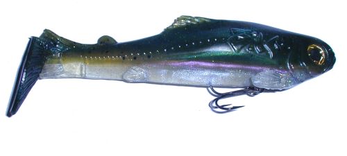 The 3:16 K-9 was released in November of 2003. This softbait is available in 7” and 8.5” and comes in two colors, a green trout and a brown trout. The 7” K-9 comes stock with a 1/0 VMC hook and weighs 2.75oz. The 8.5” is equipped with a 2/0 Owner Stinger treble and weighs in at 4.40oz. Both baits sink slowly and run naturally in the slightly sub-surface to 10 foot depth range. The 7” retails for approximately $18 and the 8.5” for $20.