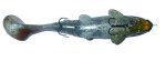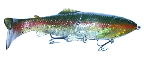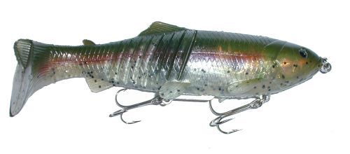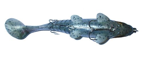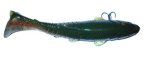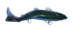 The Megabait Charlie Sr. came out in the summer of 2003. You can tell, looking at the head of the bait that it's origin is the Original Megabait Charlie, but about half way back things get a lot different. There is no bill, and there are 8 slits in the tail to give the bait a really wide tail kick at slow speeds. The internals of the bait are very interesting. There is a hard plastic head with two hook harnesses coming off of it, and the entire rigging is then covered in soft plastic. You get a continuity of color on the outside, with the rigidity of hard plastic in the head.