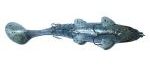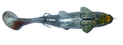 I give Megabait a lot of credit for finally coming up with a stock two hook system on a rubber bait. It's not perfect, but it beats a lot of what's out there. The first version of the lure used a metal piece imbedded in the lure to hold the second hook. You can see that in the 8" bait photo above. I liked this setup because it kept the hooks apart and hid most of the rigging. Apparently though there were some problems with this metal piece weakening and breaking off. So the current baits use a piece of heavy wire with crimps (see 10" bait photo). This setup shows a little more of the rigging but I'd much rather land what bites I get than risk losing one big fish to a broken harness, so I'd say this is a good improvement.